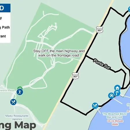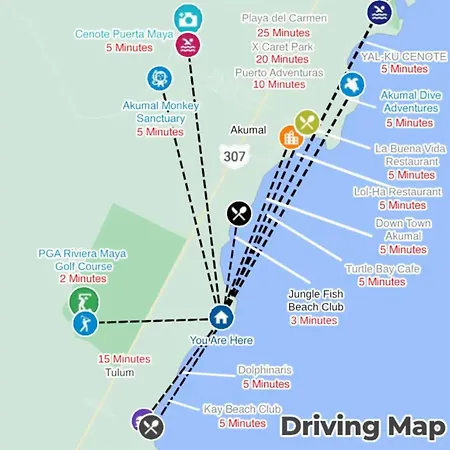 Akumal Monkey Sanctuary daireden 10 dakikalık, Aktun Chen mağaraları ise 15 dakikalık bir sürüş uzaklığındadır. Şehir merkezi daireden 2 km uzaklıktayken Playa del Carmen havalimanı 40 km mesafede bulunmaktadır. Jungle Fish Beach Club, Jungle Fish yürüyerek 14 dakika mesafede bulunmaktadır. Konaklama tesisi Akumal Plajı'a kısa sürüş uzaklığındadır.